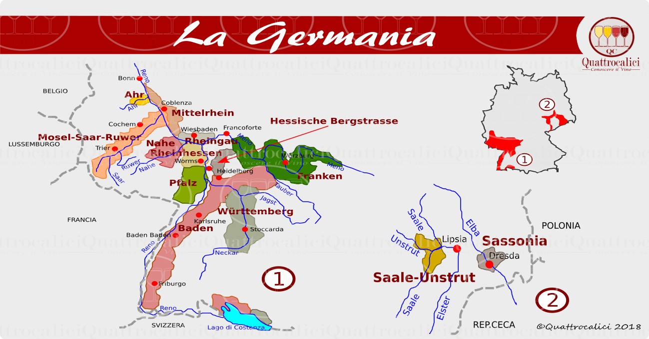Le regioni vinicole tedesche di maggior importanza godono di denominazioni di origine controllata come "Mosel", "Rheingau", "Pfalz", ecc.