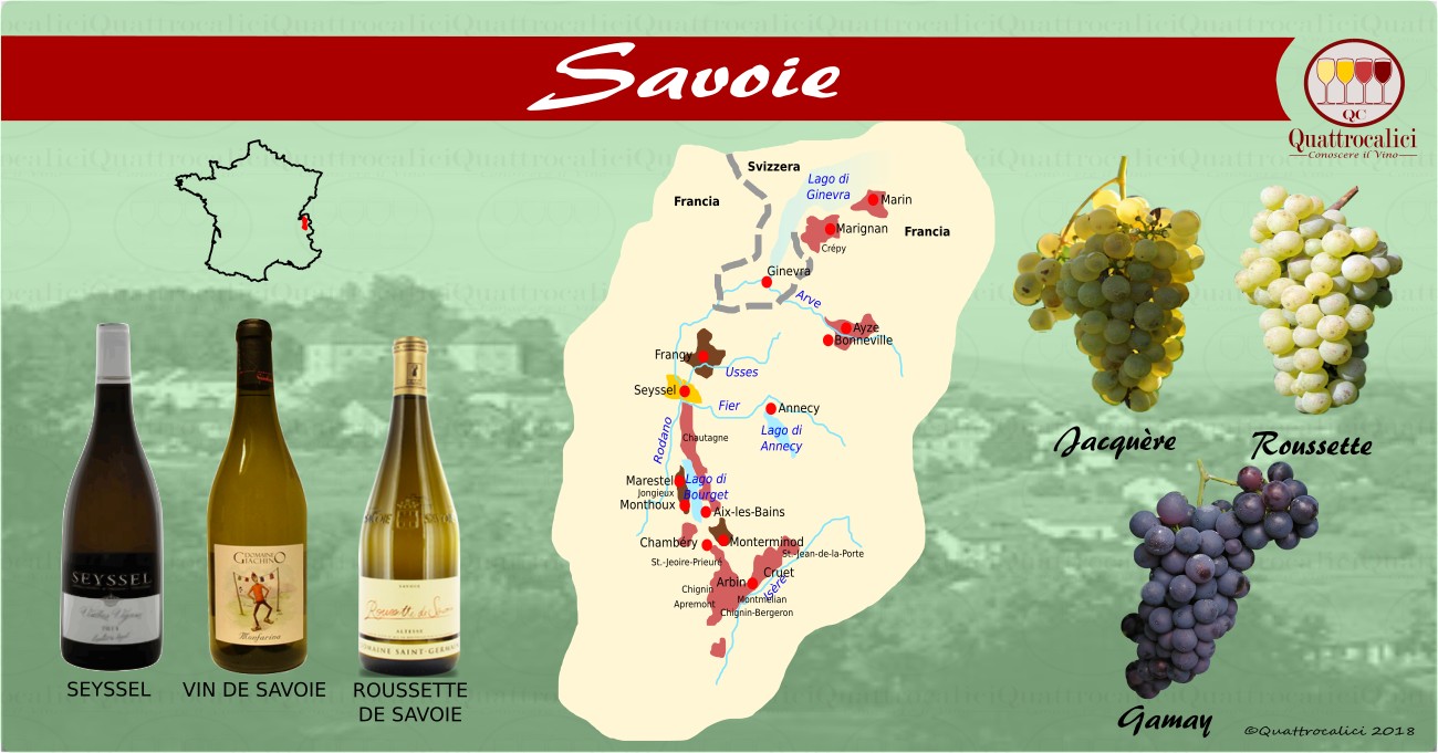 Varietà di Uva: La Savoia è conosciuta per le sue varietà autoctone. Tra le principali varietà bianche troviamo l'Altesse (o Roussette), il Chardonnay, il Jacquère e il Roussanne. Per ciò che riguarda le varietà rosse, spiccano il Mondeuse, il Gamay e il Persan.