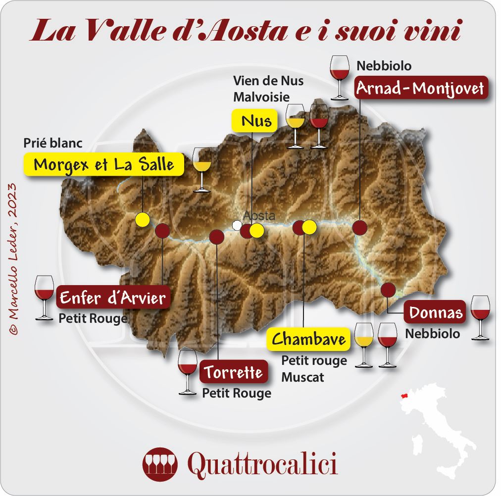 - Valle d'Aosta DOC: comprendente bianchi, rossi e rosati da varietà locali.
